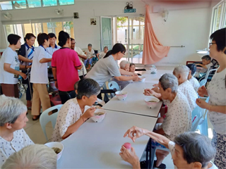 隔天中午,妇女组到双溪赖银禧老人院为长者们提供素食午餐和长者最爱吃的甜点,红豆冰。义工们也到病房为老弱病人供上白米粥。大家的的爱心举动让长者们露出幸福的笑脸。