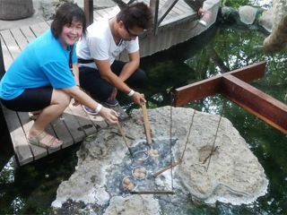 次日上午9点巴士出发到安顺,孩子们一路上轮流唱着巴赞。参观了安顺斜塔,大家顺便购买安顺特色土产,然后前往宋溪温泉休闲公园泡温泉。一到温泉园,孩子们第一时间涌到冷水池戏水玩乐,大人则在不同温度的温泉池泡温泉浴,或浸脚养神,并一起享用在冒烟的泉水中煮熟的鸡蛋。