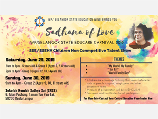 今年的嘉年华分两个阶段进行。首个层次专注于学生日常的灵性修习,如日行一善,Likhita Japam(抄写同时冥思主的名号)和Namasmarana(持名和冥想祂的相与荣耀)。第二个层次是举办综艺观摩会,让学生培养和表达他们在语言、音乐、身体运动和人际交往的才华。该观摩会为不设奖项的非竞争性教学活动,旨在鼓励德育班同学切磋互进。