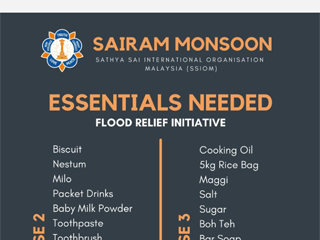 连续几天豪雨,雪兰莪州于12月17日爆发史上最严重的水灾。巴生、莎亚南、瓜拉冷岳、瓜拉雪兰莪、雪邦等地方水位高涨,数千户家园被洪水摧毁,部分灾黎受困屋顶,饱受饥寒交迫之苦。在这个艰难时刻,雪隆区多个赛中心的救援队全力协助救灾行动,努力救出灾民,并提供热食、必需品,以及医疗卫生服务。国际赛组织马来西亚分会也宣布成立“SAI RAM MONSOON”赈灾基金,让赛信徒和社会好心人捐赠赈灾物资。