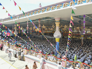 法会于 2 月 14 日早上6点的吉时开始,由中央信托会管理受托人Sri RJ Rathnakar和夫人 Smt Himavahni Rathnakar 主持。当金色的阳光柔和地照亮整个礼堂时,一个令人叹为观止、精神振奋的时刻就此展开。用鲜花装饰得庄严华丽的赛伊什瓦拉林伽(Sayeeshwara Lingam)从巴赞厅(Bhajan Hall)内领出到薄伽梵圣陵前。信徒们双手合十表达崇敬,海螺声和鼓声响彻云霄,示意着至高无上的湿婆神的降临。