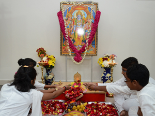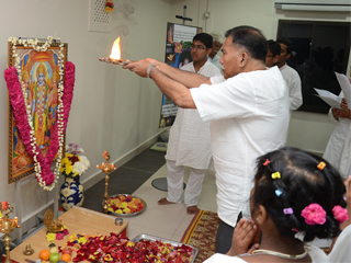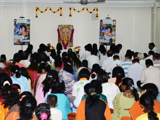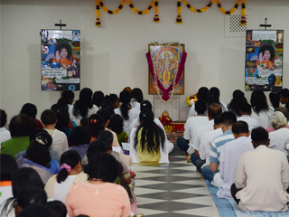 过后众信一起念诵“Om Sri Rama Jayam”真言108遍,接着道德班的同学们领唱12首赞歌。圣火仪式之后,大家享用美味的素食。