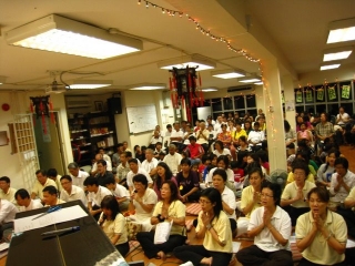 节目,晚宴完毕。洗涤橱具盘碗,搬移桌椅板凳,抹擦地板;个个乐此不疲,已没有宾主之分。徐赛兄问我:那洗碗的妇女是谁?我说: 我不认识; 还有拿"坡饼"来的那个妇女我也不认识; 这么多的食物, 我也不知是谁报效的?。 心灵深处直呼:“吧吧,这是你所安排,你所要的吧!” 大家的齐心协力合作下,思菩提举行了这简单,欢欣的庆典;套句 JOHN 的话:“大家快乐,SWAMI 也快乐。” 这不就是大家所期望的吗? 吧吧,生日快乐! 蔡金莲