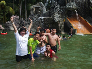 次日上午9点巴士出发到安顺,孩子们一路上轮流唱着巴赞。参观了安顺斜塔,大家顺便购买安顺特色土产,然后前往宋溪温泉休闲公园泡温泉。一到温泉园,孩子们第一时间涌到冷水池戏水玩乐,大人则在不同温度的温泉池泡温泉浴,或浸脚养神,并一起享用在冒烟的泉水中煮熟的鸡蛋。