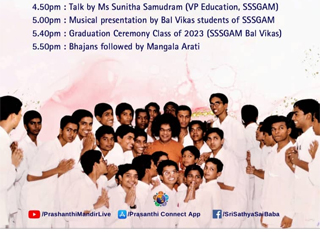 此次活动的一大亮点是心育班毕业生获得难得的机会在赛古鲁湾大殿内演出。马来西亚分会教育组主任苏尼塔萨姆德拉姆(Sunitha Samudram)女士分享了她对人类价值观在塑造儿童成为理想赛信者的见解。随后毕业生们呈献一场音乐会,他们深情演绎多首赞歌,并穿插了个人转变经历的叙述。在接下来的2023年度心育课程毕业典礼上,Sri K Chakravarthy 和 Sri RJ Ratnakar 受邀为毕业生颁发证书,以表彰他们的成就和付出。