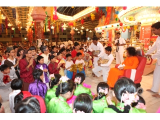 五时四十八分,在信徒们引颈期盼下,Baba坐着轮椅在舞狮和四十多位唱着新年歌的德育班学生引领下,从祂的精舍慢慢地来到了Kulwant Hall中央的神坛前。Baba点燃了莲花形状的蜡烛,为今年的新春庆典掀开序幕。