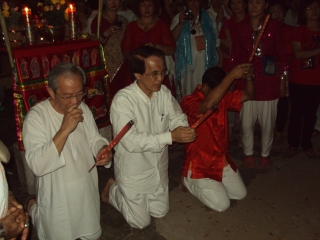 祭拜仪式于傍晚七时半开始,恭请新年庆祝筹委会主席Billy Fong赛兄首先跪拜上香,大家跟着轮流烧香,抱着感恩的心来拜天公,祝愿天下太平,风调雨顺,国泰民安,也祈求合家平安,幸福快乐。大家也象征性燃烧金银纸钱,非常热闹。祭后众人一起享用糕点和茶果,有说有笑,于晚上九时散会。