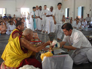 2月7日上午8点,信徒们会聚于N7宿舍后的草场上祭拜天公。祭坛上摆满斋菜、鲜花、糕点、水果等供品。大家轮流上香祈福,并一起念诵Gayathri真言。祭祀完毕焚献天公金。庆典活动也吸引了不少各族信徒参与其盛。