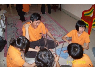 早上9:10分, 活动准时开始。在纪老师的带领下,所有学员都念了一段祈愿词。接着, 纪老师引导营员放松心情, 静下心来静坐。在短短的几分钟内,学员们都感到特别轻松, 更感觉自己的心灵被净化了。在应用“十巧健康法”活动了身体后, 家长与孩子开始分组进行活动。林老师带领小朋友学习歌曲《感恩的心》的手语及准备日本寿司让父母享用。在过程中,只见小朋友都兴致勃勃地用水果来装饰盛装寿司的盘子。他们都对亲手制作寿司这项活动显得很有兴趣,并认真聆听老师的指示来完成寿司。