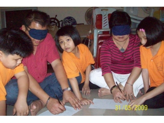 之后,纪老师又给了一个指示,那就是请家长们把眼睛蒙上,并且根据孩子的指示画出现场提供的图案。现场所提供的图案是一幅有着一张饭桌,两张椅子及一盏灯的图画。现场可见小朋友们用不同的方式向各自的父母叙述,有的小朋友因为觉得很有趣而笑个不停;有的小朋友则耐心地告诉父母图案的小细节;有的则因为自己的父母无法明白自己要表达的意思而显得不耐烦。这项活动除了能够促进亲子关系,更让家长从中得知自己平时对自己孩子说话的方式。这是因为孩子就像一面镜子,如果我们朝着镜子里的孩子笑,那么孩子也理所当然会报以微笑;反之,如果我们对着镜中的孩子口出恶言,孩子自然也会恶言相向。明白了这个道理后的家长开始学会如何聆听孩子的心声。