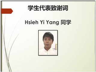 林爱群老师在心育班报告里总结了网课学习近况,她表示本年度“优秀奖状”得奖者有13人,而“出席奖状”得奖者则有16人。值得一提的是,林敏茹同学的出席率达到100%,实为难能可贵。典礼上,谢易洋同学代表全体同学对老师们的辛勤付出表示衷心的感谢。