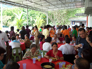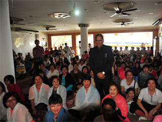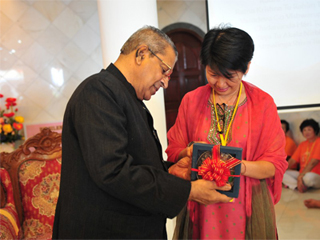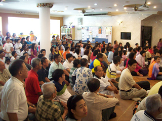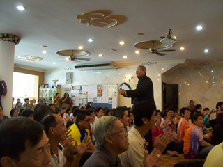 大家就座后开始唱赞歌,而教授也趁兴领唱一首梵文赞歌。他致词时表示有幸前来风景优美的浮羅交怡宝岛与众信见面,更感恩大家的热情招待。他语重心长地说虽然世尊已离开了他的肉身,他的精神永恒不变,信徒们都可以感受到他无所不在的加持。教授也说有时信徒可能忘了,甚至于离开峇峇,但峇峇绝不放弃他的信徒。有一次,一个赛学院的同学跟世尊说:“峇峇,我承诺将改掉我的坏习惯,并永远跟随你。” 世尊笑着答道:“你承诺,却不守约(you promise and you miss)!” 而世尊是绝不会爽约的。教授也呼吁大家继续到百善地精舍,礼拜圣陵,领略圣地的殊胜。