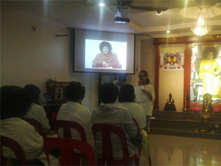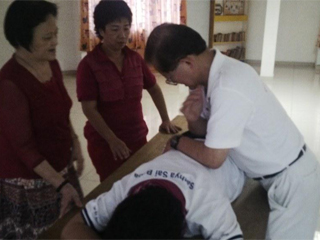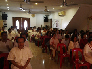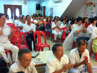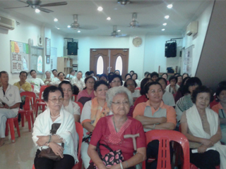享受了丰盛的午餐后,蔡金莲赛姐主持妇女组的‘光’之课程,而卢文光赛兄在中心一楼讲解示范传统养生保健方法。