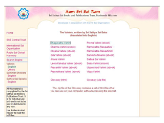 沙迪亚赛国际组织将为广大信众提供所有Vahini系列和Sathya Sai Speaks系列的电子书。大卫格莱士博士(Dr David Gries)投入了大量的时间和精力编辑这些电子书,作为献给世尊的服务。