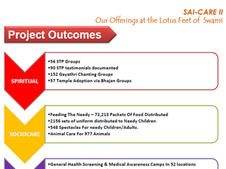 马来西亚赛组织在全国各地展开了一系列活动纪念世尊降世90周年。这项命名为‘SaiCare II’的大型服务计划涵盖了5个领域:灵修、社区服务、医药、环保和心育。透过这项计划,赛信徒们向社会上的弱势群体伸出援手,同时对国家建设作出贡献。