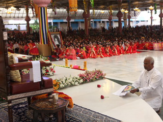 国际赛组织第4区主任Dr Ravindran 于2016年2月13日在百善地精舍向信众提呈马来西亚‘SaiCare II’的工作报告,并邀请马来西亚赛理事会会长Mahendran赛兄把报告书献在圣陵前,将大马信徒们所修的布施、诵经、行善等功德遍施法界众生。