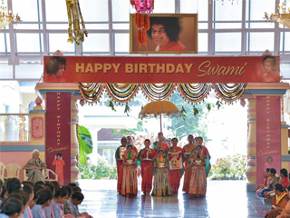 11 月 23 日,赛古鲁湾大厅迎来了庆祝活动最吉祥的时刻。百善地峇赞团为信众奉上一首首优美而庄严的赞歌。接下来中央信托会呈交年度报告于斯瓦米圣陵前。在一片祥和的赞歌声中,信众纷纷到世尊圣陵前参拜祈福,并送上生日贺卡和蛋糕。当天下午,信众护送金光闪闪的檀车在精舍举行巡游,场面壮观、热闹非凡。大会邀请了古典歌手考希基 查克拉博蒂(Kaushiki Chakraborty)压轴演唱,庆典活动圆满落幕。
