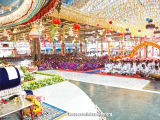 主宾在致辞中表示,薄伽梵的肉身虽然幻灭了,但是祂的功德却长留人间,法喜持续充遍宇内,光辉始终照亮世界。接着大会播放薄伽梵于1996 年 8 月 21 日的神圣讲道。上午的法会于11时圆满结束。当天中午,主办方按照传统在山景体育场举行赠衣施食活动,受益群众18000余人。