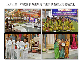 11月21日,全印度赛服务组织青年组呈现了一场引人入胜的多媒体节目,题为“赛服务组织 – 走向转变的正道”。自2017年以来,全印度赛服务组织一直在印度南部各州举办斯里沙迪亚赛征文比赛,吸引了数十万年轻人的参与,让他们有一个表达新观点和展望更美好未来的平台。今年共有来自5517所学校的272300名学生参与比赛,25名学生脱颖而出,在当天的颁奖礼上获得奖牌及证书。